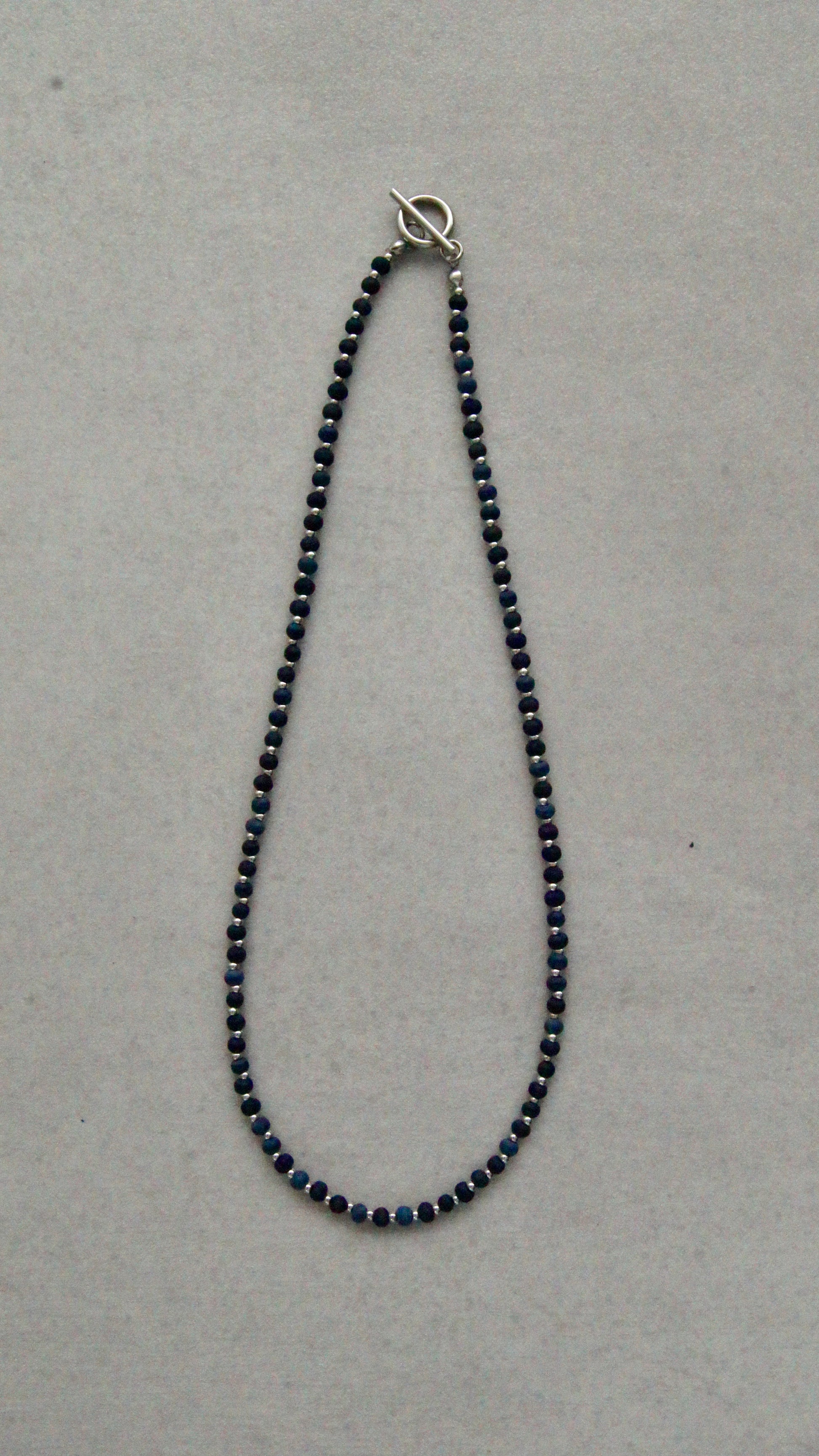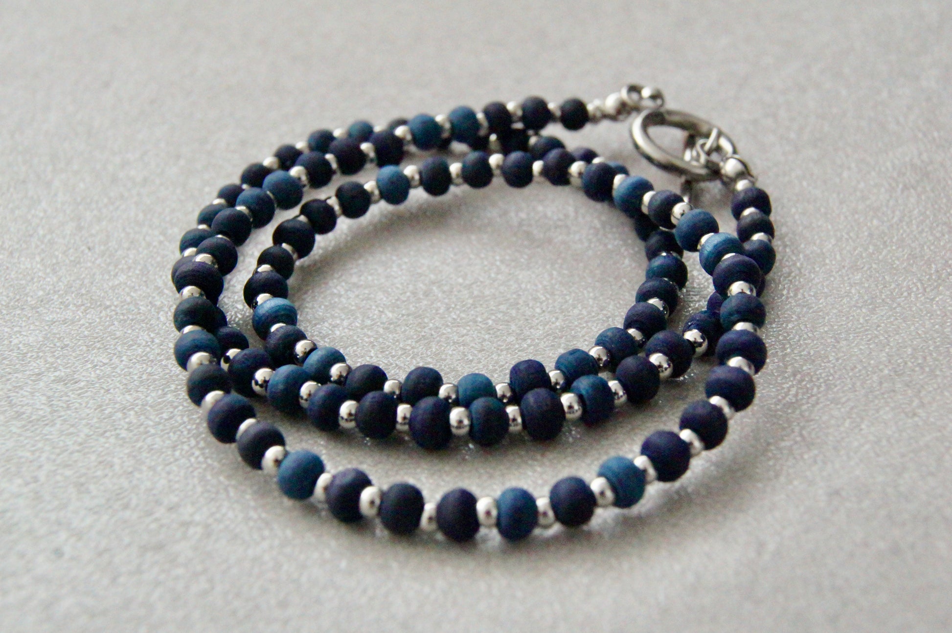 島藍で染め上げたウッドビーズと、ステンレスビーズを組み合わせたネックレスです。